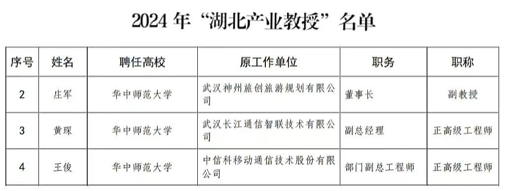 近日,中共湖北省委人才工作领导小组办公室、省教育厅公布了2024年度“湖北产业教授”人选名单,全省共60人入选。我校推荐申报的庄军、黄琛和王俊成功入选。