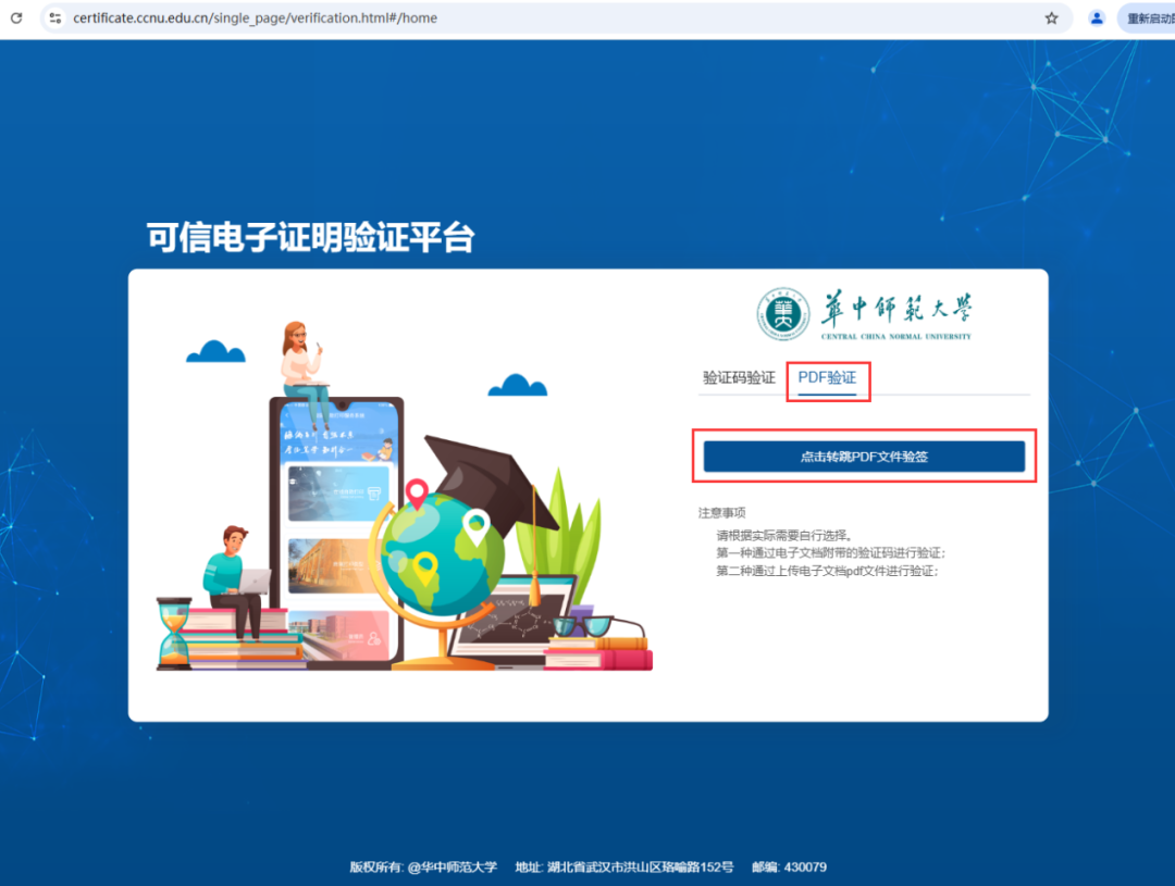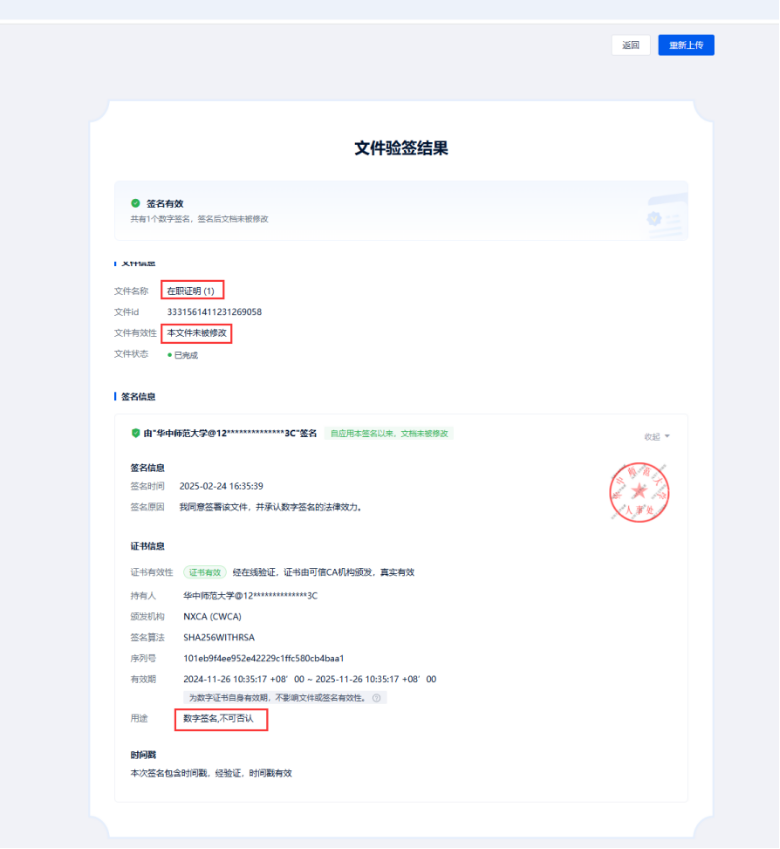 第三方可访问我校“可信电子证明验证平台”上传签署文档进行验签。信息化办公室网站nisc.ccnu.edu.cn上“常用服务”下的“可信电子证明验证平台”。
