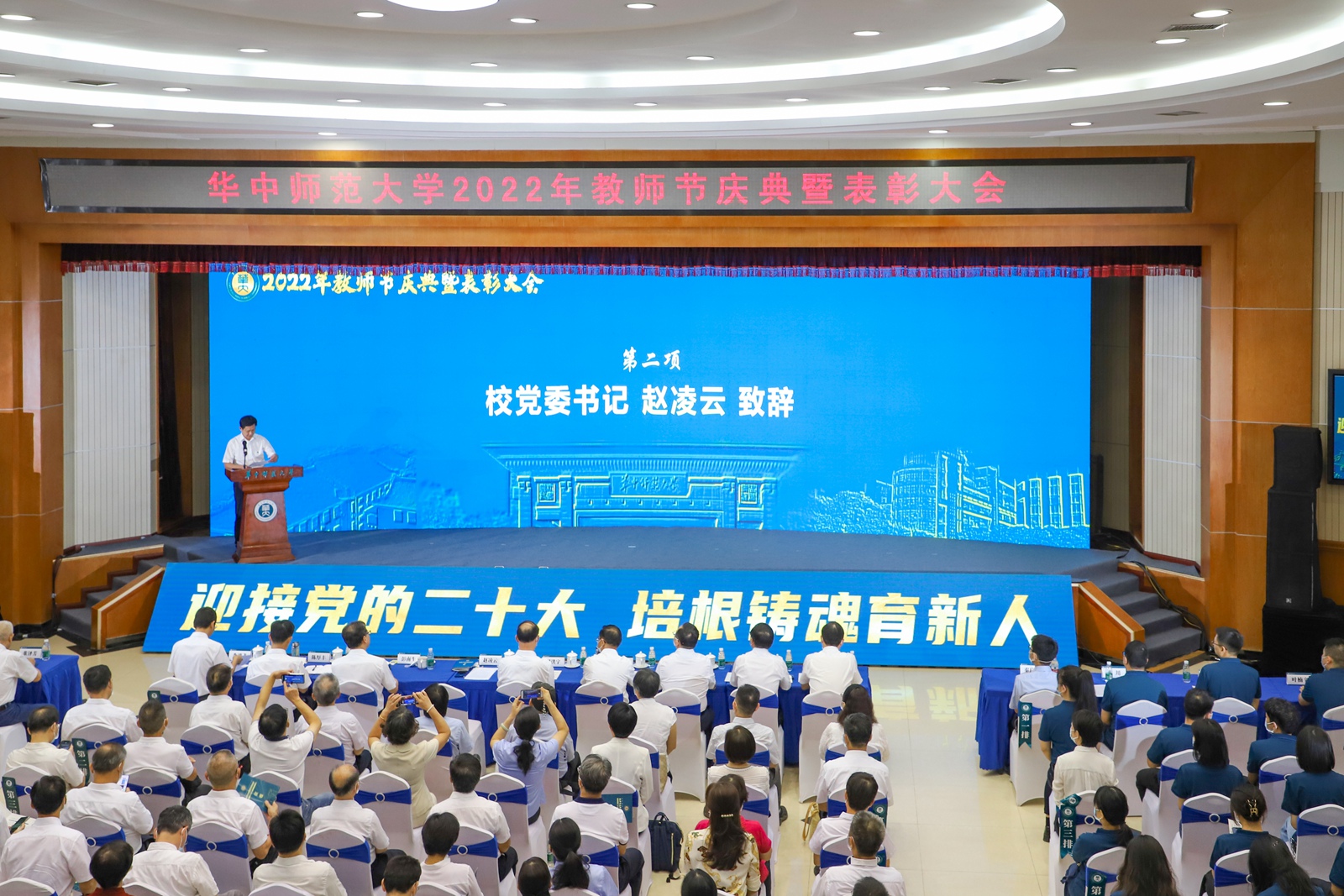 大会在雄壮的国歌声中拉开帷幕,校党委书记赵凌云代表学校党委、行政,向广大在岗和荣休的教师致以崇高的敬意,向新加入华师大家庭的青年教师表示诚挚的欢迎,向关心支持学校事业发展的广大校友和社会各界人士表示衷心的感谢!