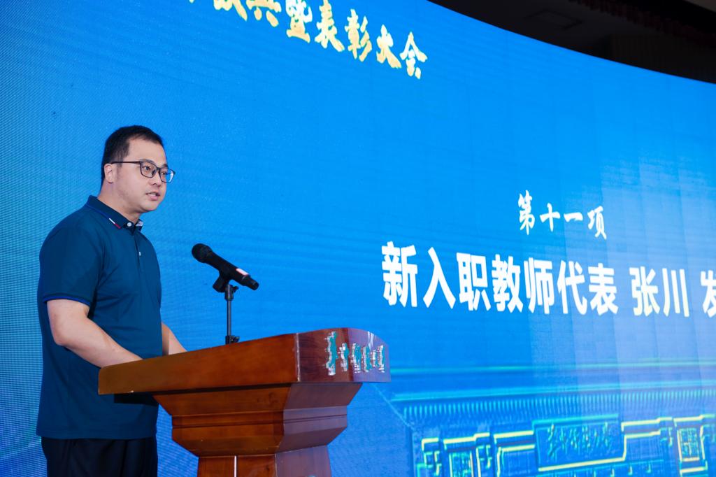 新入职教师代表、体育学院张川老师表达了对学校关怀的感谢及成为我校教师的自豪之情,并表示将会抓住重要机遇、努力提高本领、涵养家国情怀,秉承“求实创新 立德树人”的华师校训和“忠诚博雅 朴实刚毅”的华师精神,努力完成传道授业解惑的本职工作,争做学生为学、为事、为人的“好老师”,成为塑造学生品格、品行、品味的“大先生”,为学校各项事业再上高峰贡献智慧与力量。