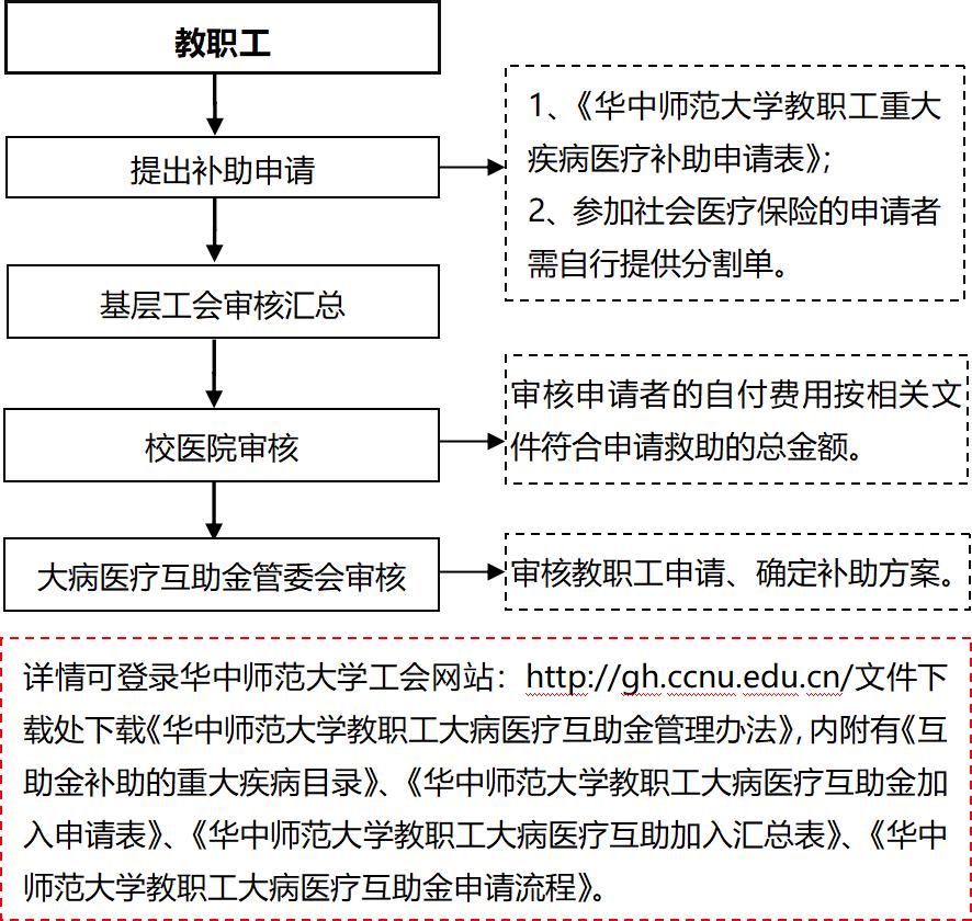 缴费方式:每年一次性缴纳180元(每月15元)互助金,在自愿签署了《华中师范大学教职工大病医疗互助金加入申请表》后,由财务处从个人工资中代扣代转入互助金账户中,以后在年度规定时间内未提出退出申请的将视为继续参加,财务处自动代扣代转。