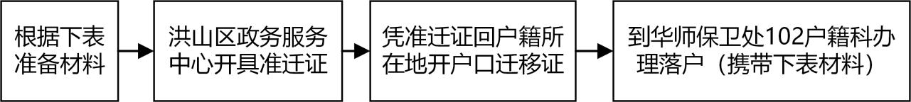 1. 人事部证明 2. 入户证明(省人力资源和社会保障厅) 3. 武汉市中心城区迁入人口入户通知书(省人社厅) 4. 户口迁移登记表(省人力资源和社会保障厅) 5. 省人力资源和社会保障厅文件 6. 户口本或迁移证 7. 2张一寸照片 |