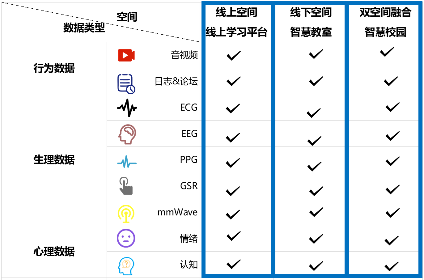 融合线上线下多空间学生数据,综合采用(音视频等)非接触式感知技术和(可穿戴设备等)接触式感知技术,开展以学习者为中心的感知技术创新与应用,实现全时空的学习过程追踪,从“行为-生理-心理”三个层面实现学习状态的全面量化。