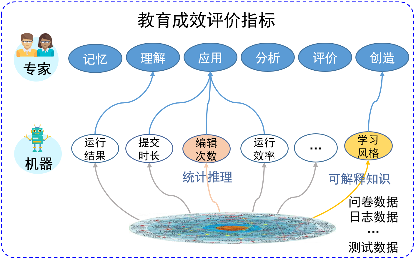 人工智能、大数据等新一代信息技术是教育评价改革的重要技术力量。课题组近几年长期致力于人机混合增强的教育智能评测研究,旨在通过融合教育专家的评价经验,引导机器智能开展基于大数据的过程化、全面性、科学性与高效率评测方法研究,并建立教育智能化评价标准体系,为全面深化教育评价体系改革提供技术支撑。
